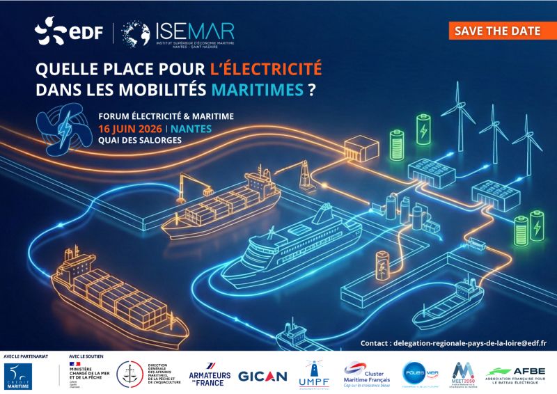 Le transport maritime associe de nombreux acteurs économiques de la construction navale, de l’exploitation et du passage portuaire. Si la décarbonation se met en place, elle intégrera l’électricité. Dès lors, comment ces acteurs vont intégrer l’électricité ou ses dérivés en carburants dans les navires de demain ? Et parallèlement, comment se feront les éventuelles productions et surtout les fournitures portuaires ? Rendez-vous le 16 juin à Nantes pour réfléchir ensemble lors de ce premier événement EDF & ISEMAR avec le partenariat du Crédit Maritime, le soutien du monde maritime français, dont le Cluster Maritime Français, ainsi que des acteurs publics, privés et portuaires du territoire de Nantes Saint-Nazaire.